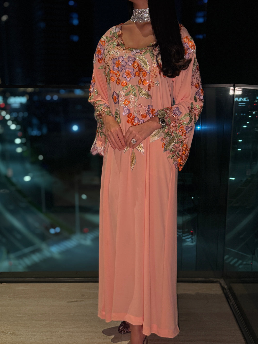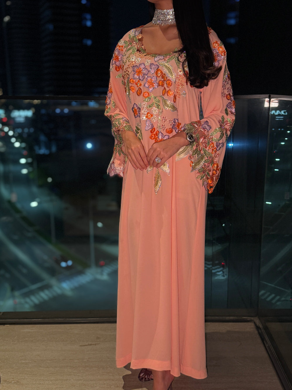 🌺 Crafted in a soft peach fabric that radiates elegance.
