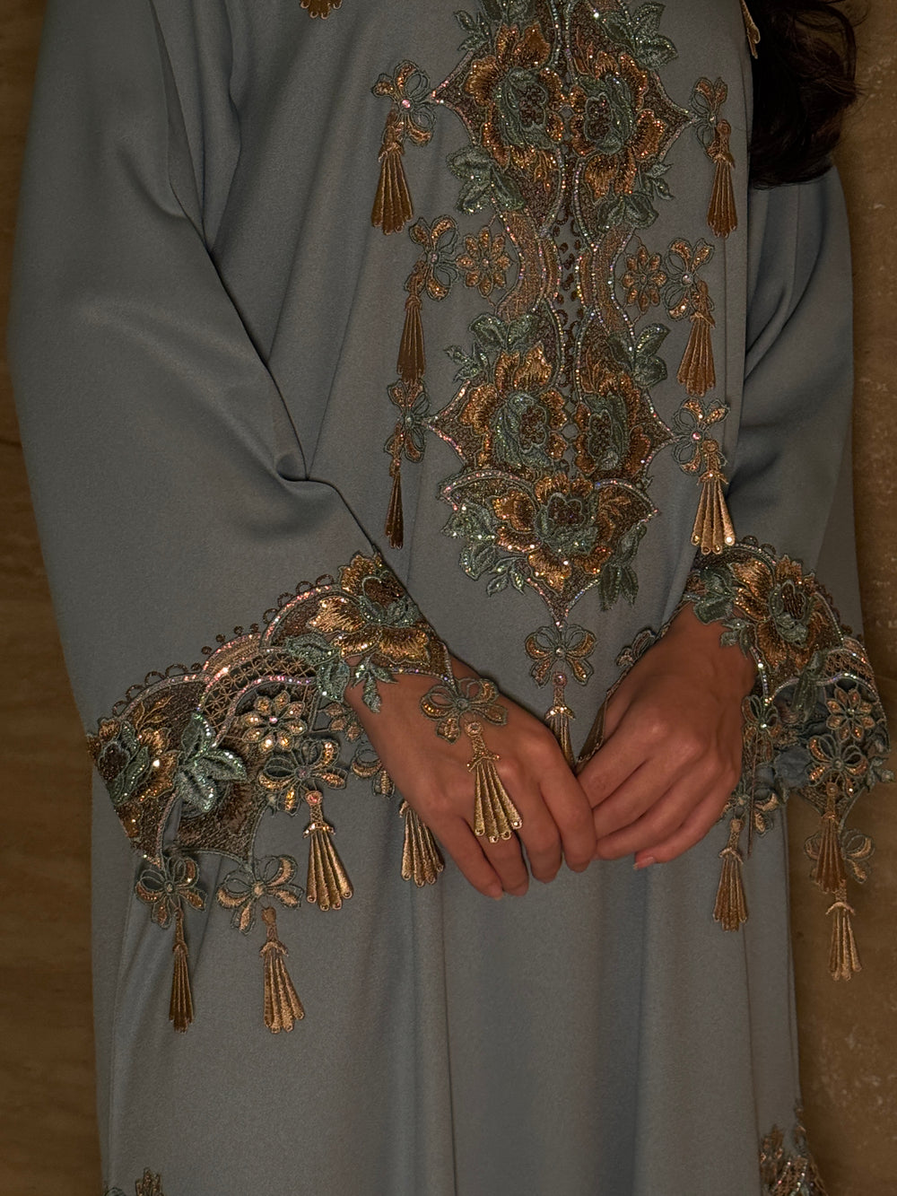 Design: Flowing kaftan silhouette with elegant floor-length drape.