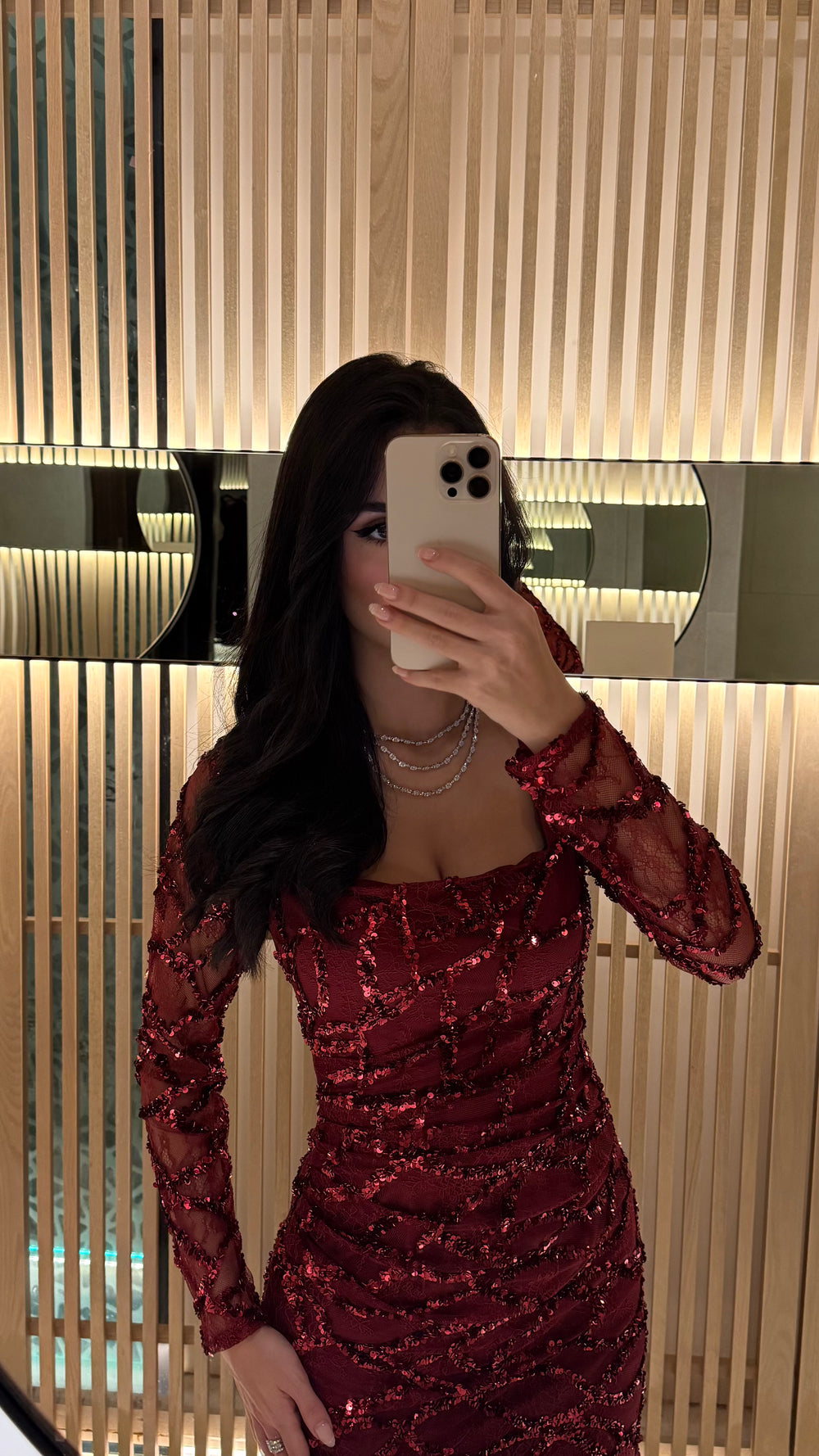 Sheer long sleeves embellished with matching sequins for a delicate yet glamorous effect.