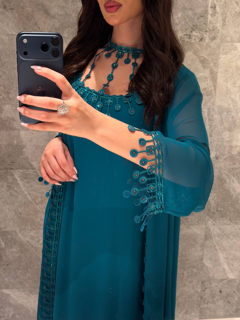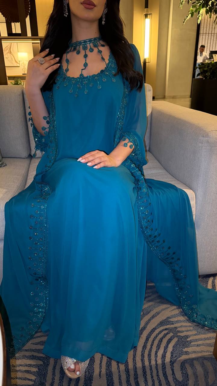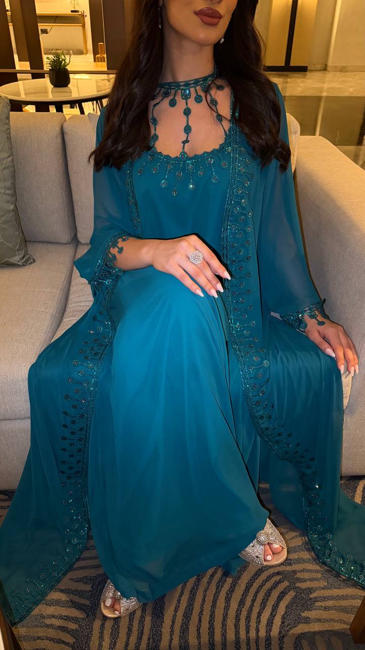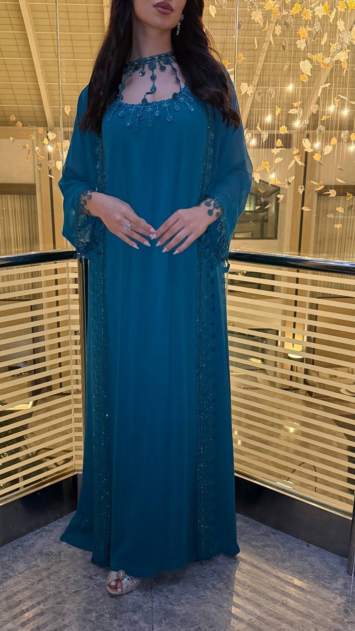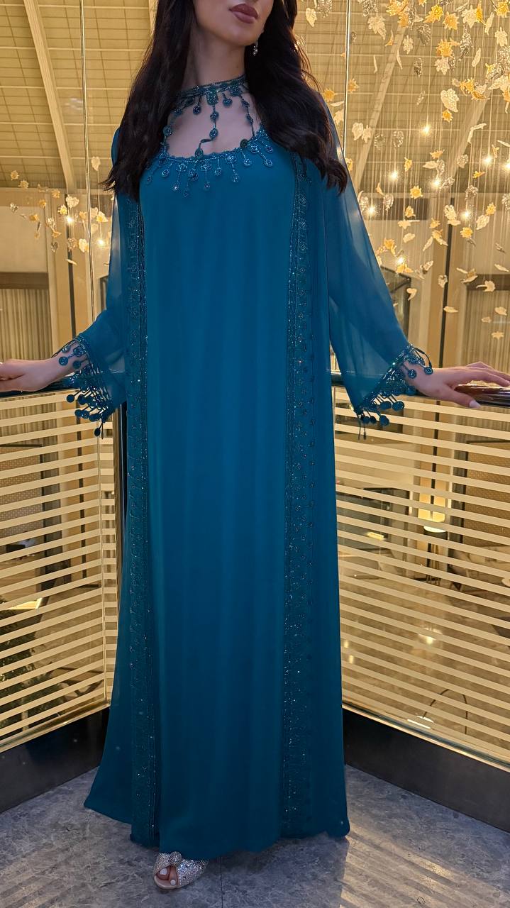 Elegant jalabiya crafted in a rich teal/emerald tone for a luxurious evening look