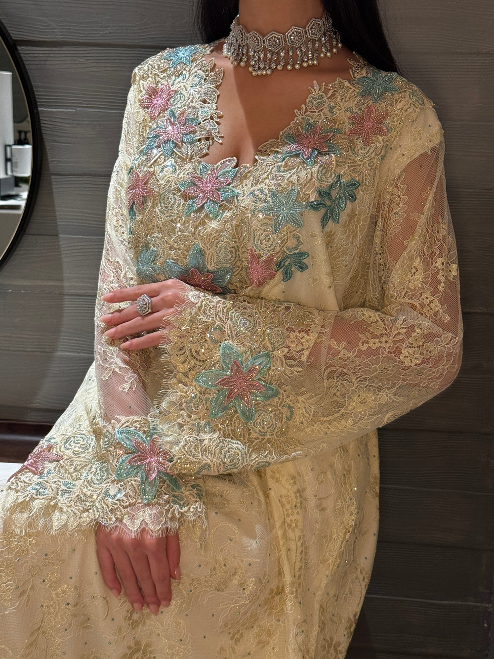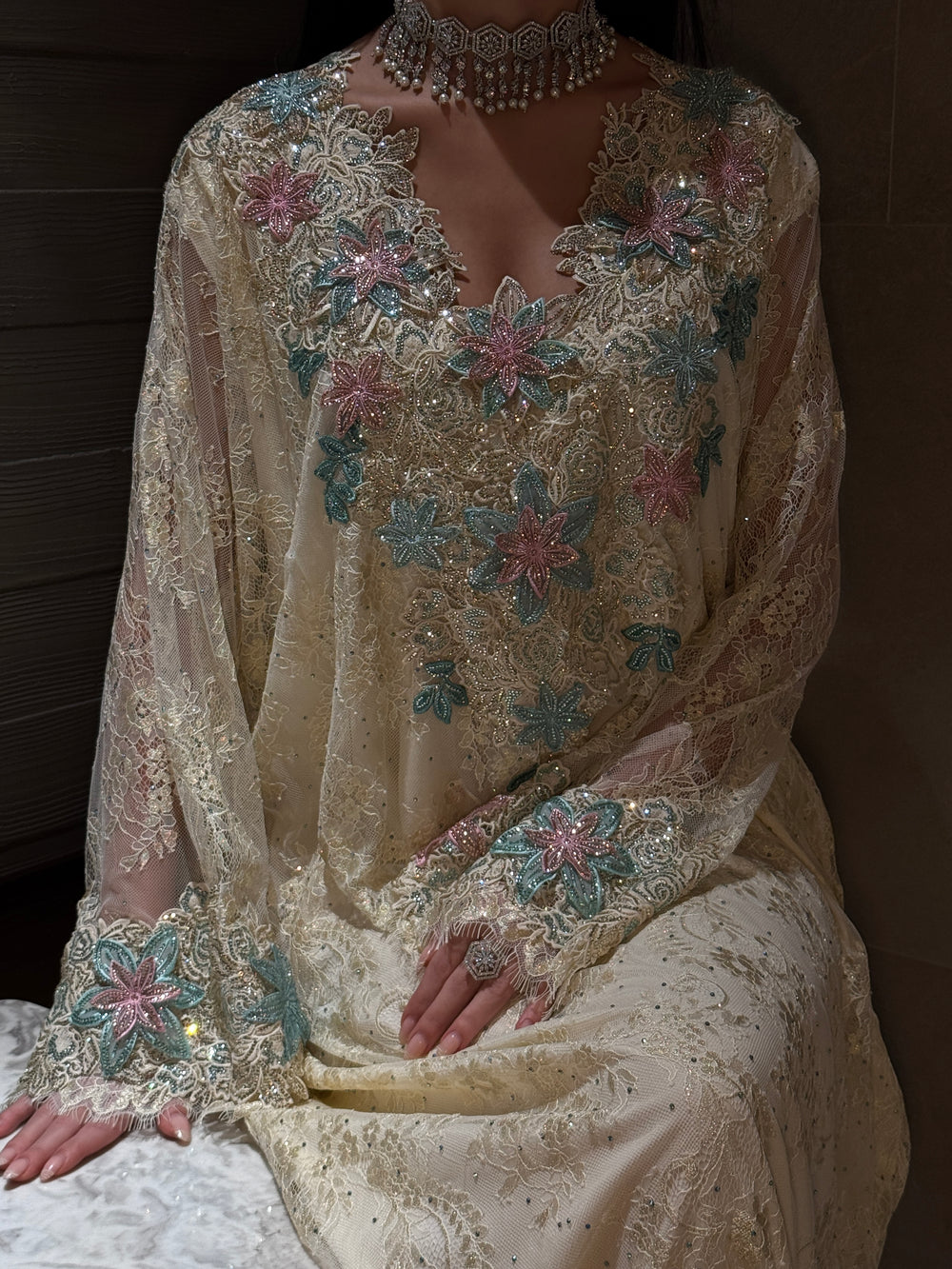 Features intricate embroidery in soft pastel tones—pink and turquoise floral motifs