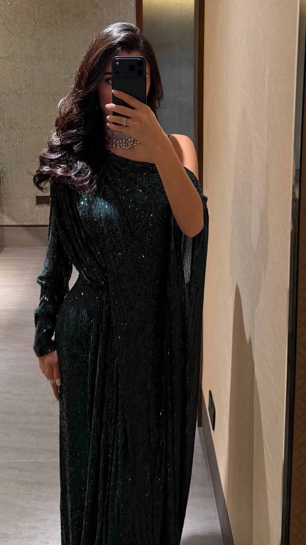 Flowing emerald-green sequin fabric with a soft, luminous shimmer