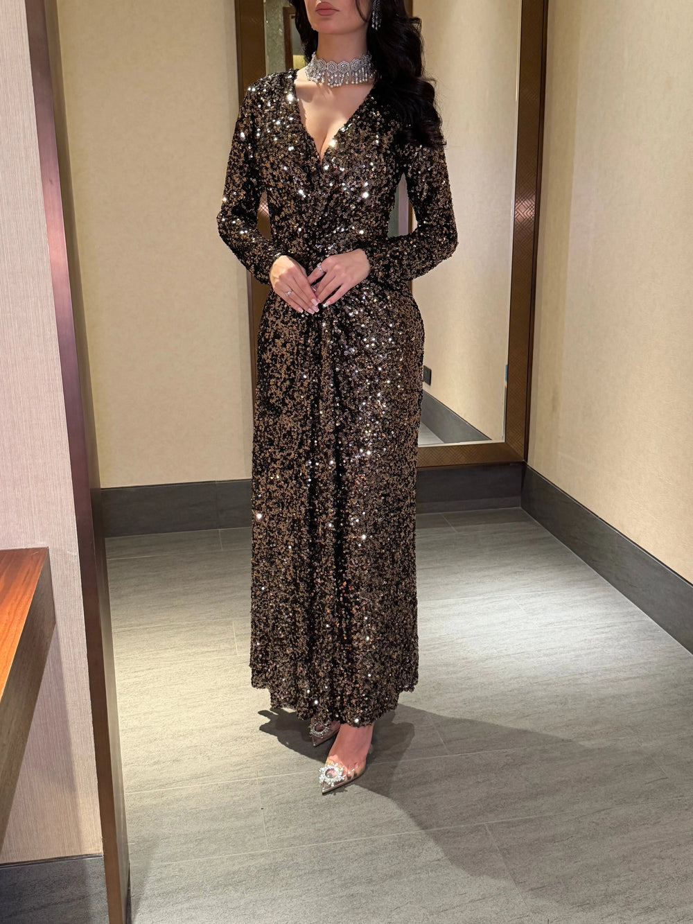 Full-length gown adorned with dense gold-bronze sequins for a radiant glow