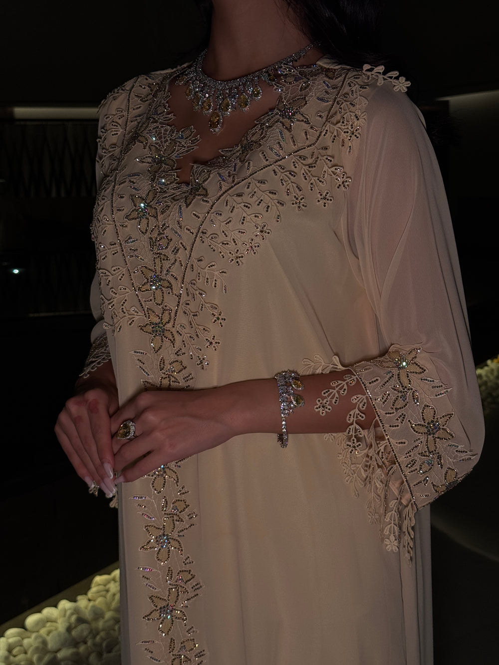 Intricate gold floral embroidery enriched with shimmering crystals.