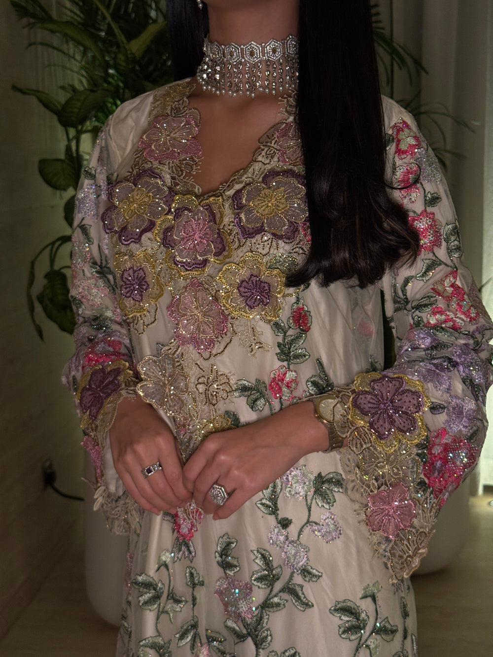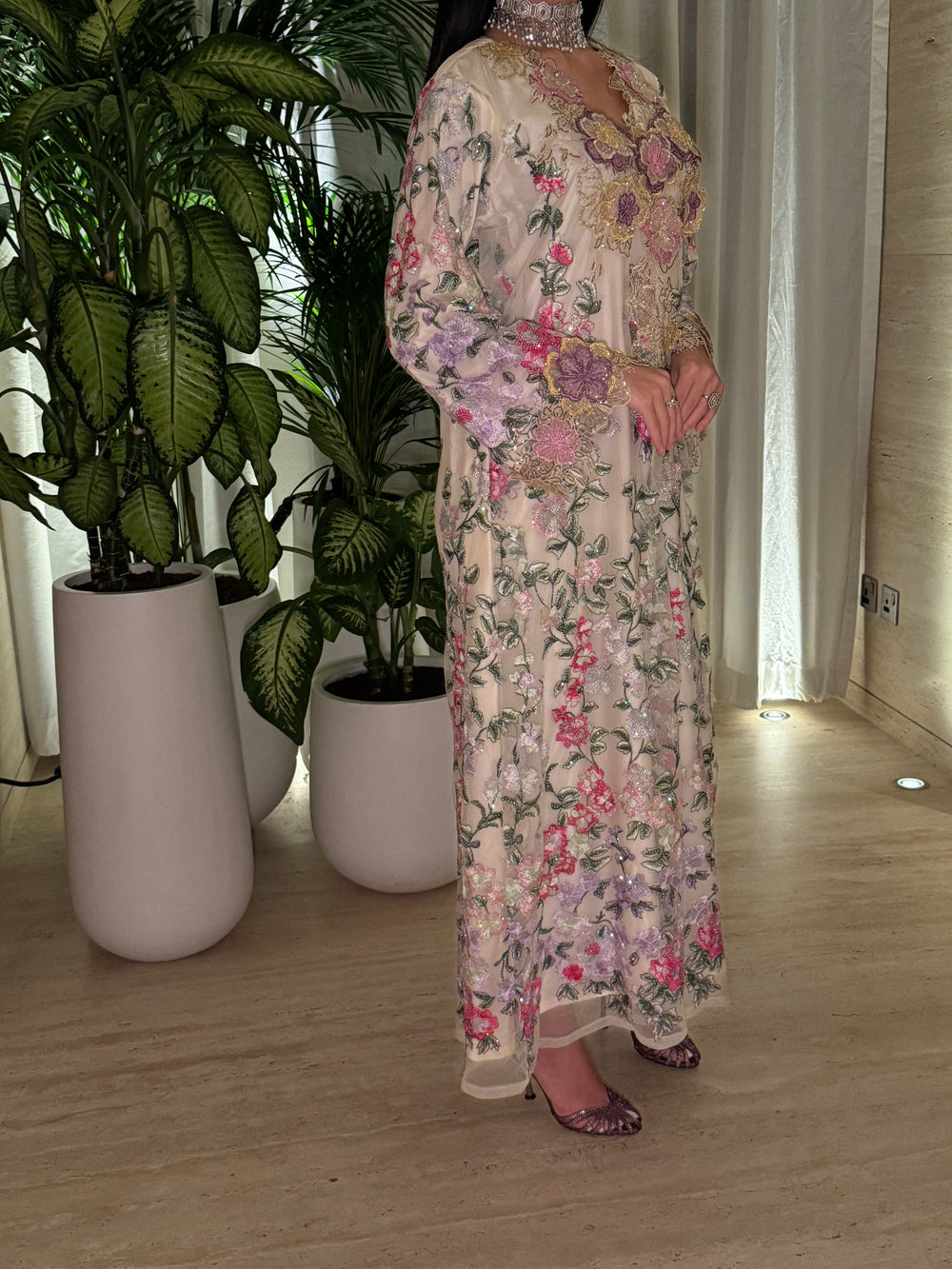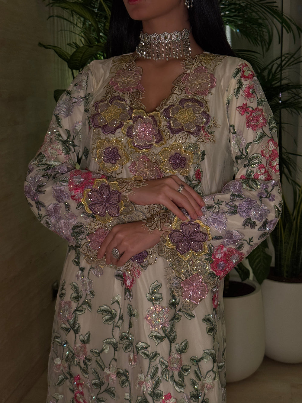 Neckline: Deep, embroidered V-neck with delicate craftsmanship.