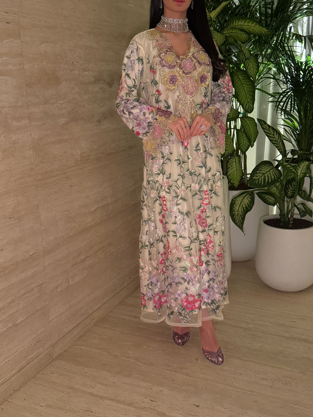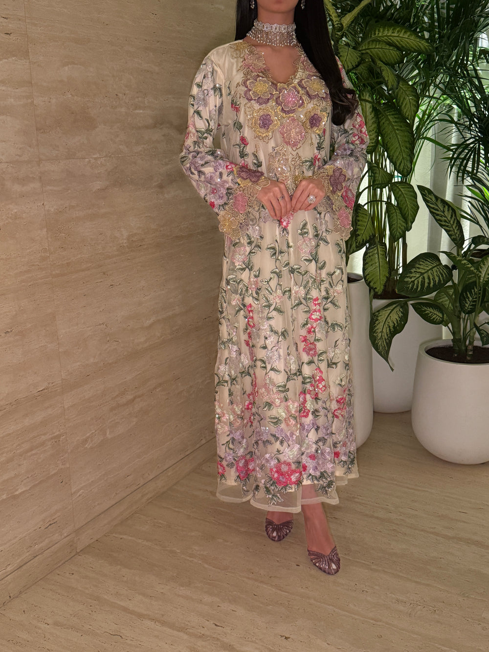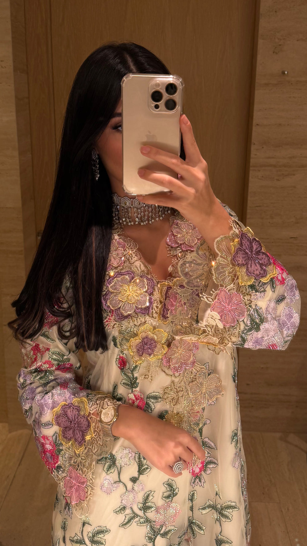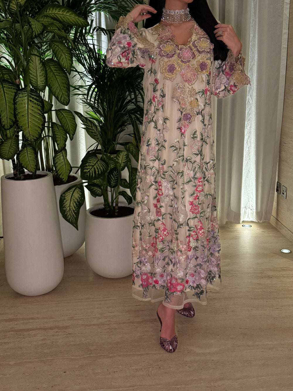 Neckline: Deep, embroidered V-neck with delicate craftsmanship.
