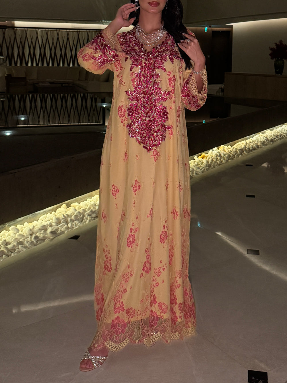 Color: Soft golden yellow base with intricate rose-pink embroidery.