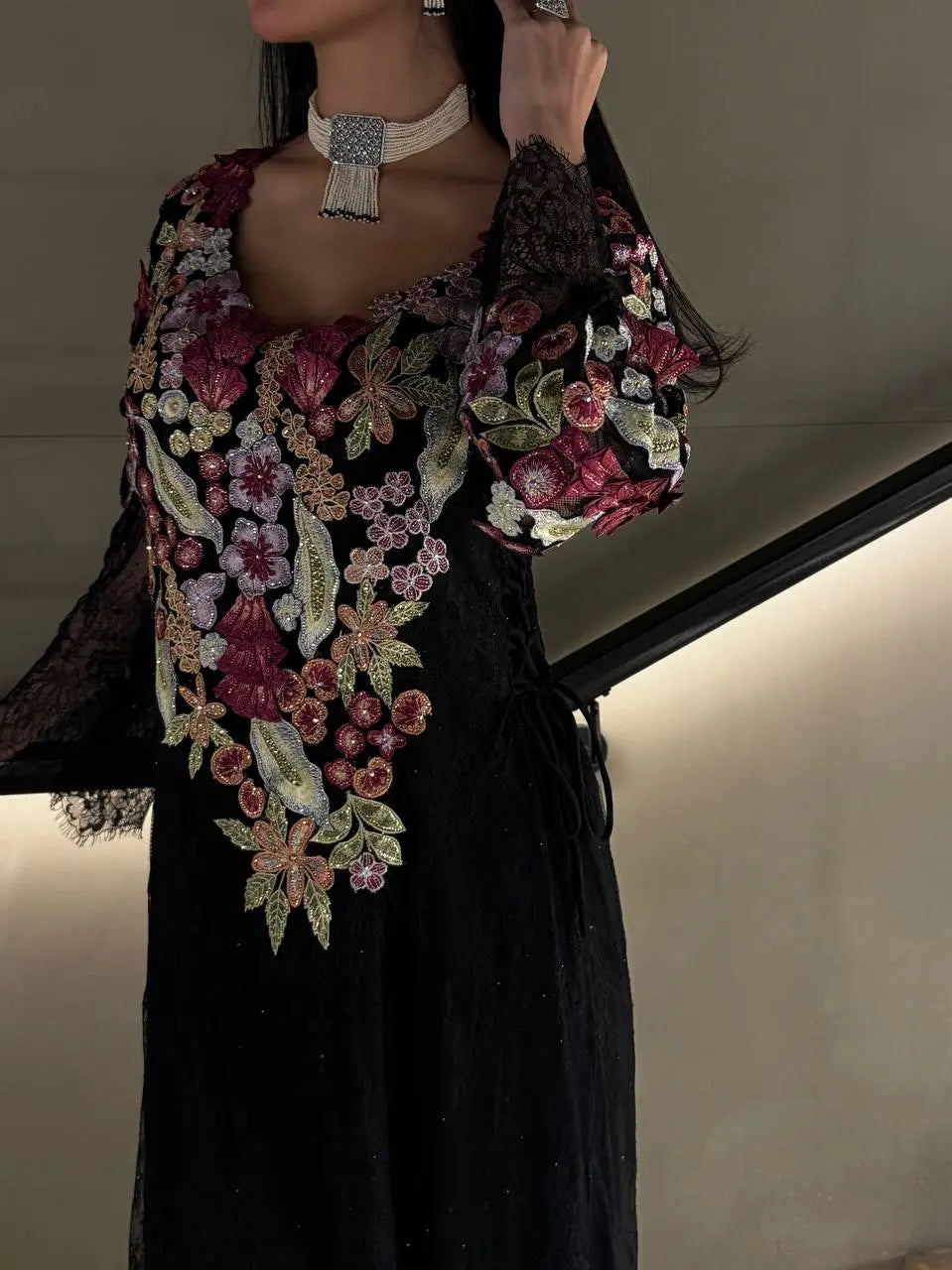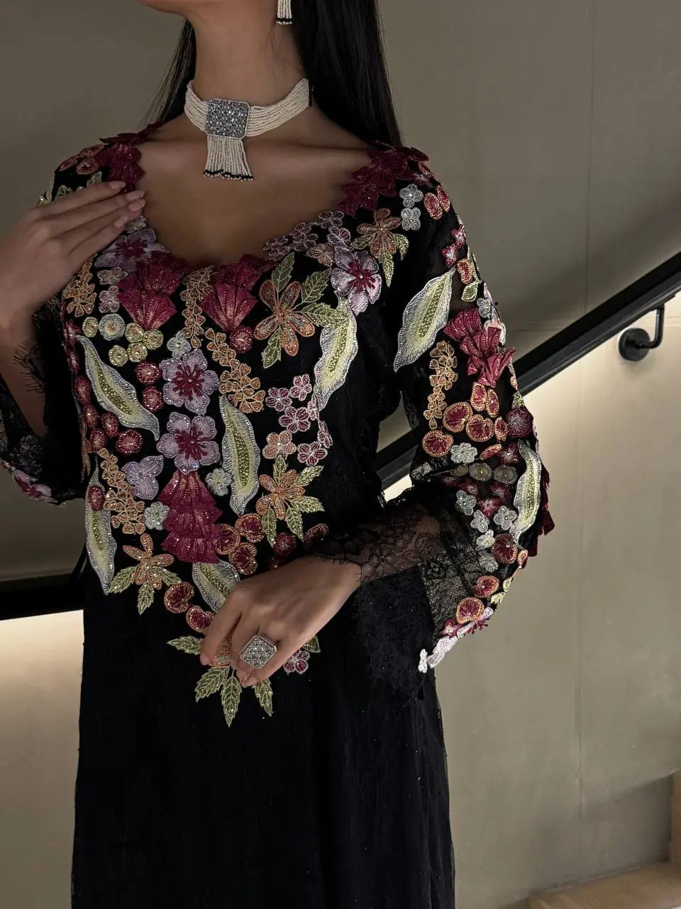 Rich floral embroidery in deep jewel tones for a striking contrast