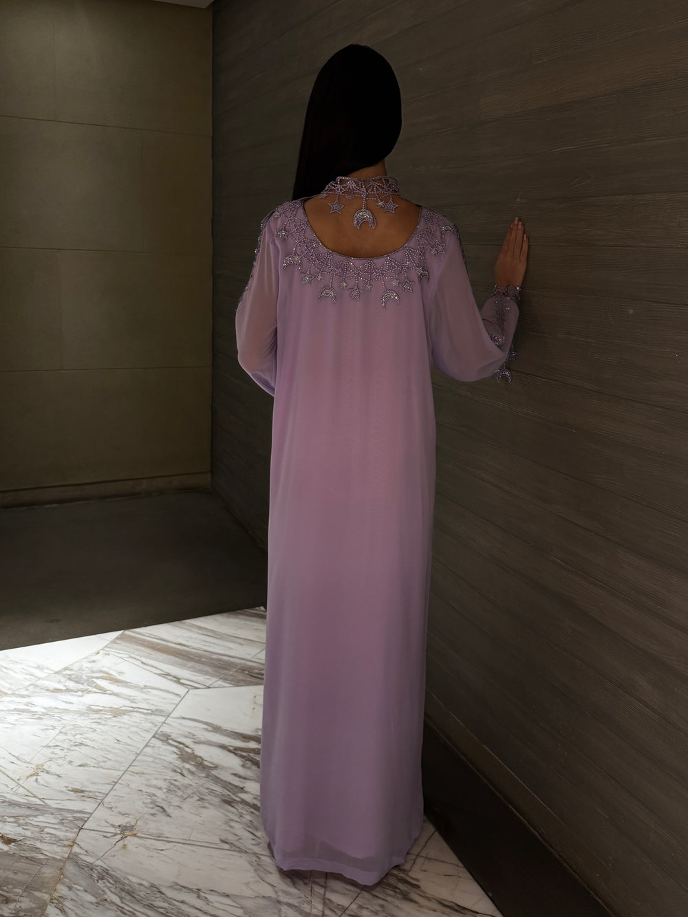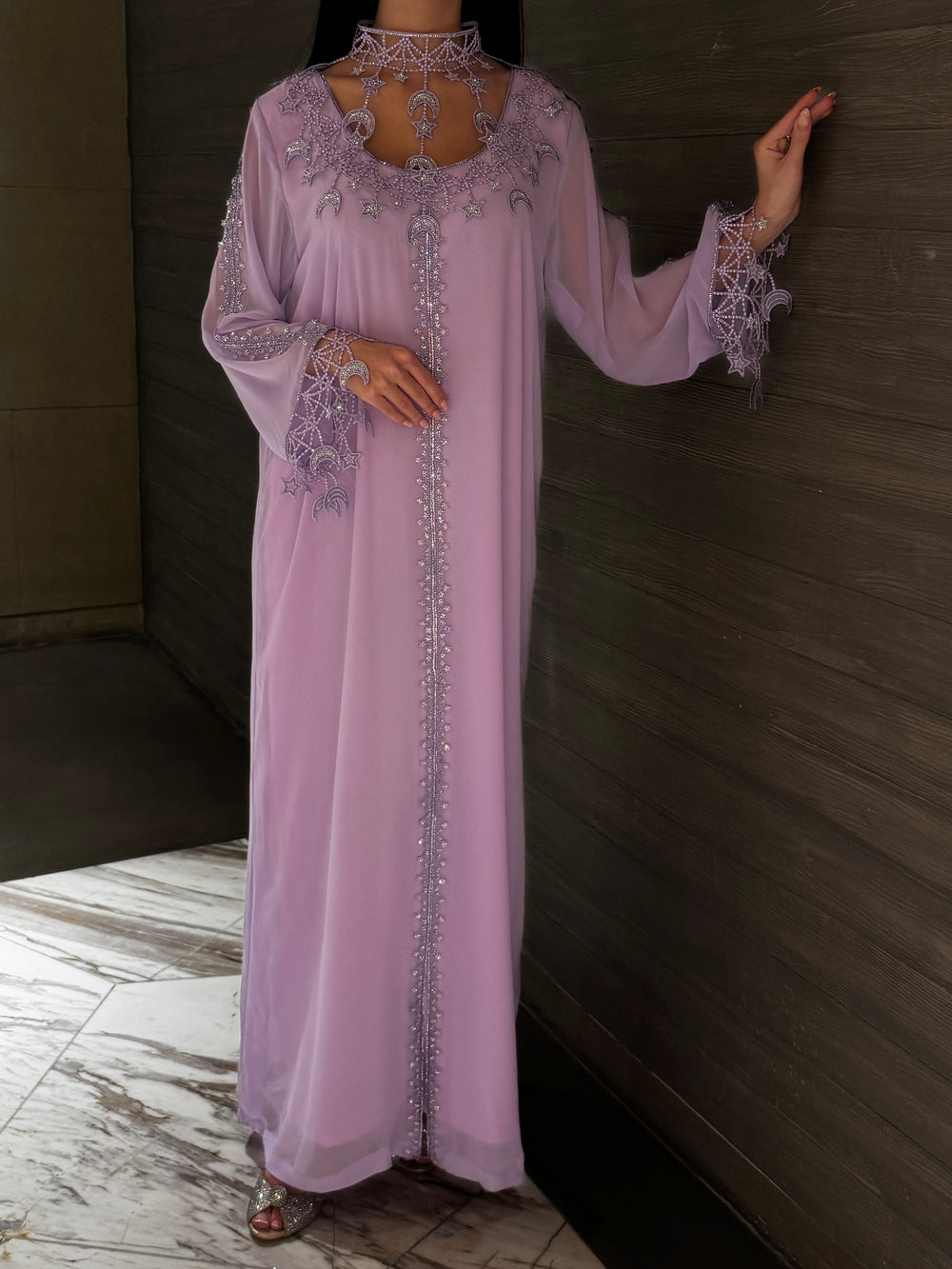 Intricately embellished with silver crystal embroidery inspired by celestial moon and star motifs