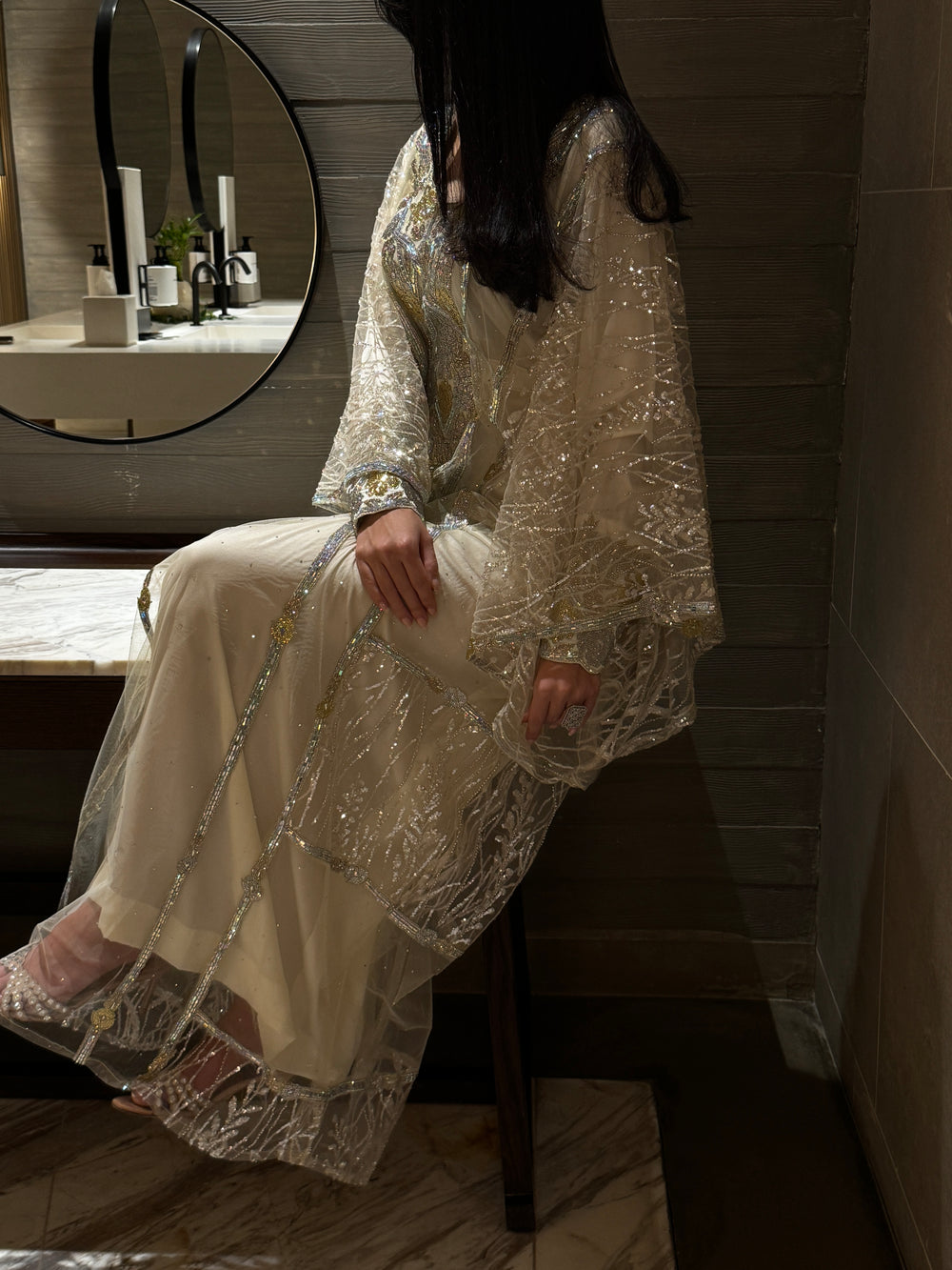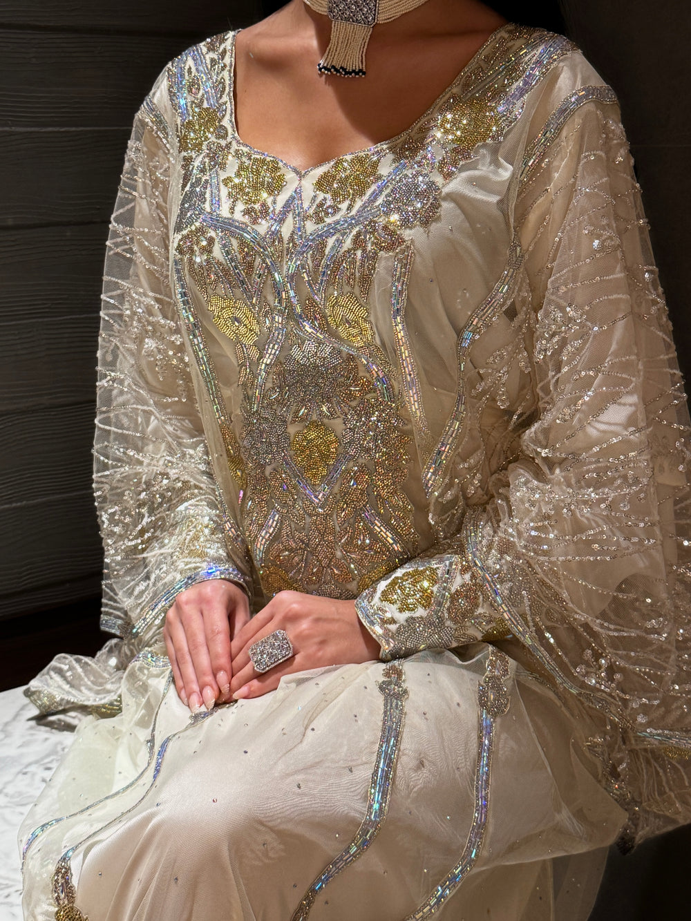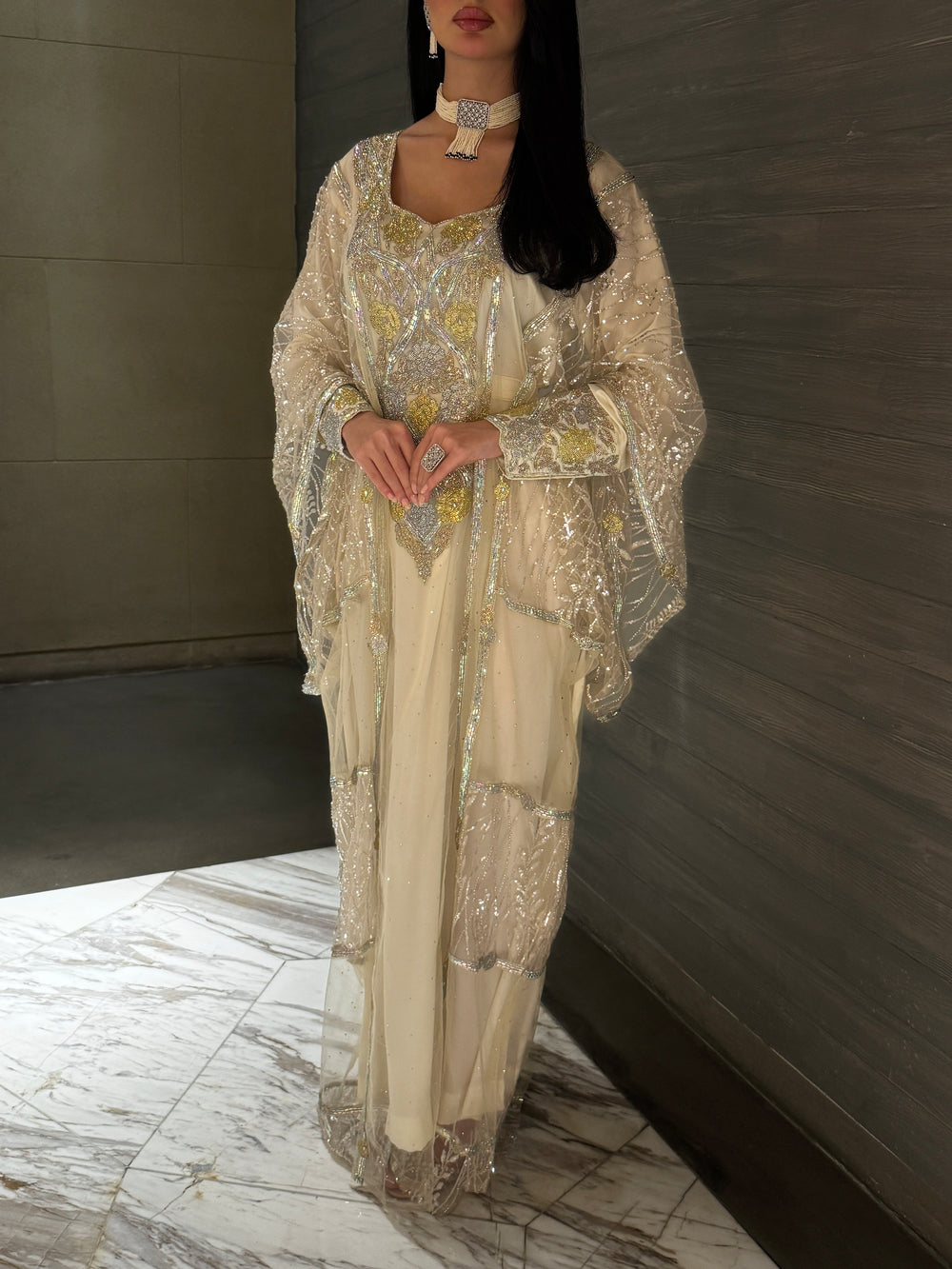 Design: Embellished with delicate gold embroidery along the neckline, sleeves, and hem.