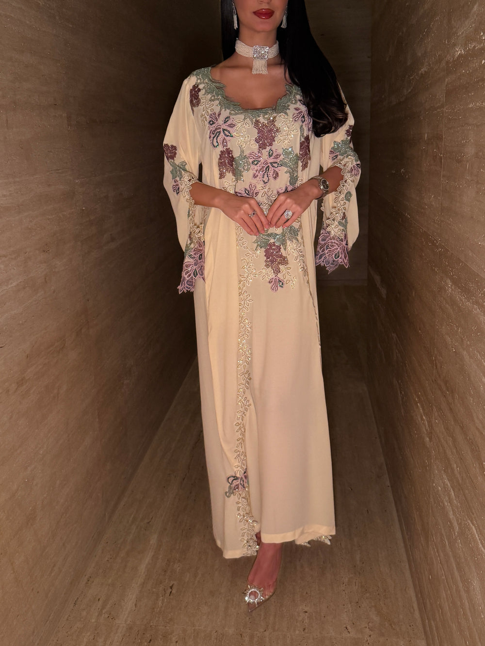 Sleeves: Wide kaftan-style sleeves with intricate embroidered edges for a regal silhouette