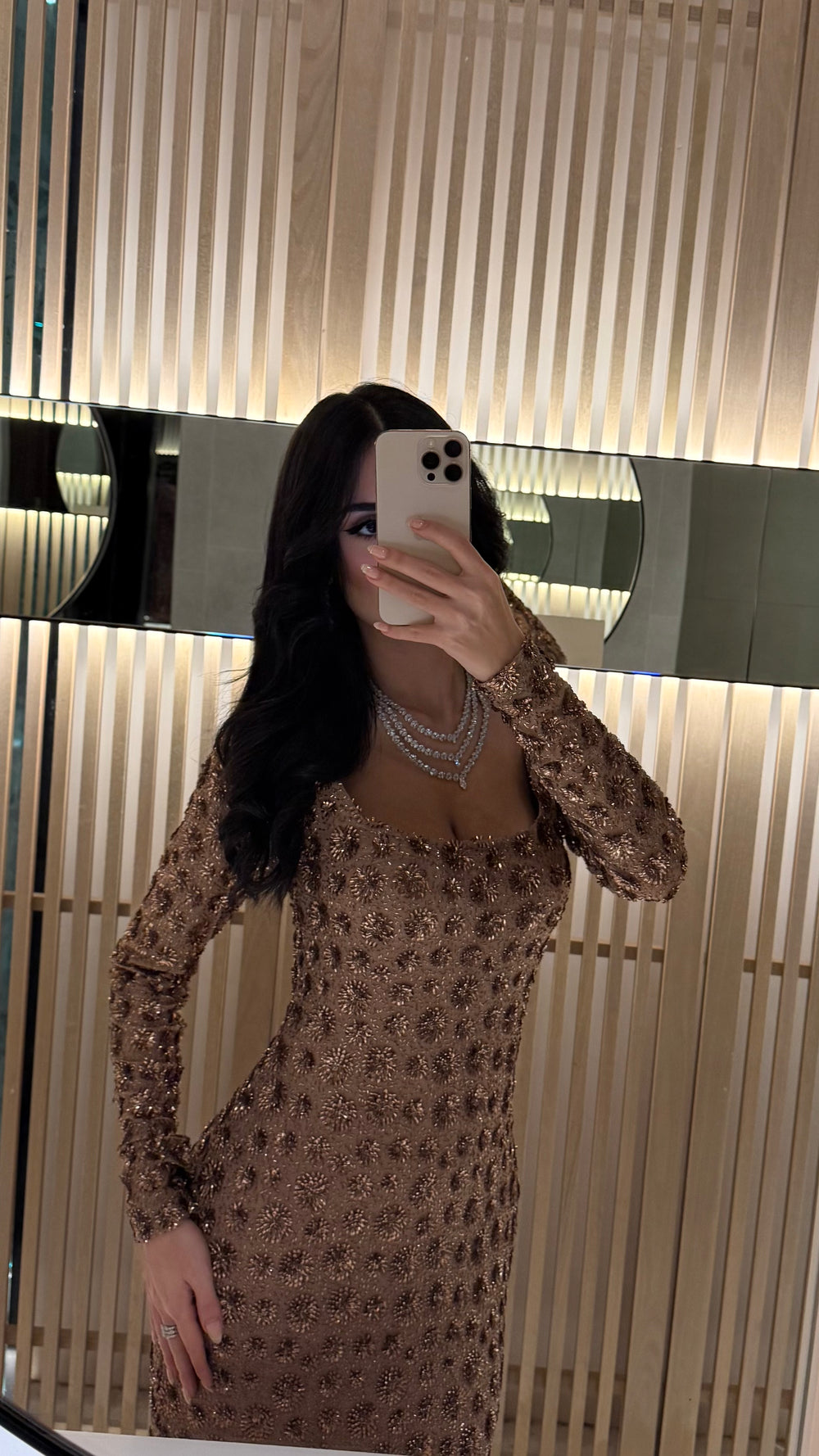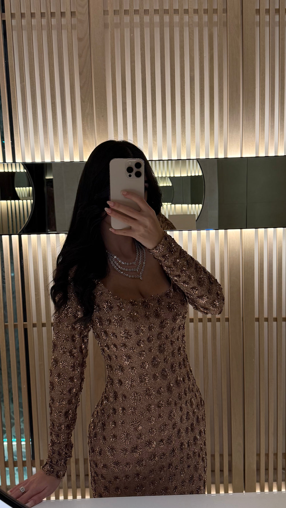 Covered in dense rose-gold beadwork and floral-inspired embellishments
