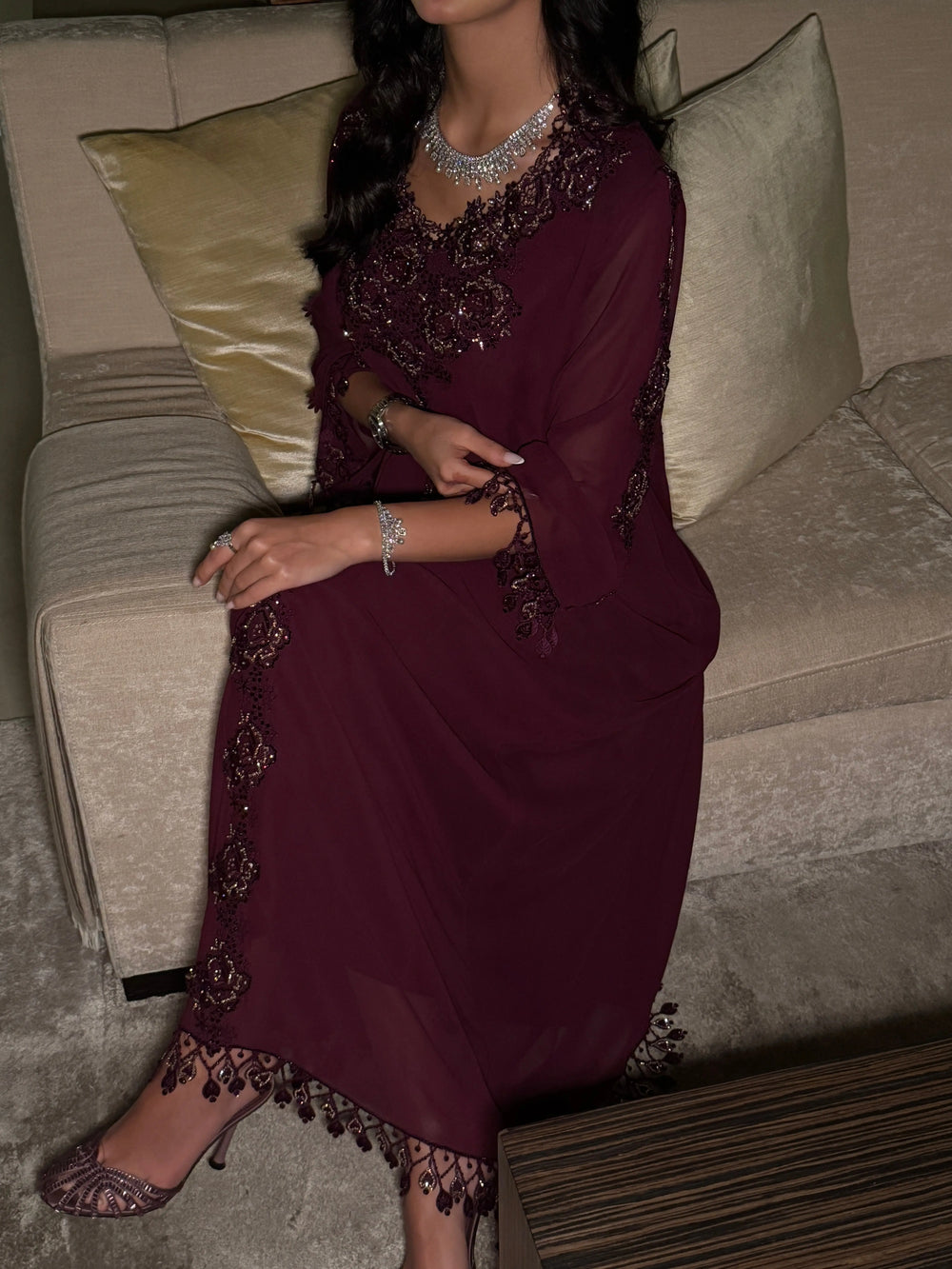 Intricate hand-embellished lace embroidery on neckline, sleeves, and hem