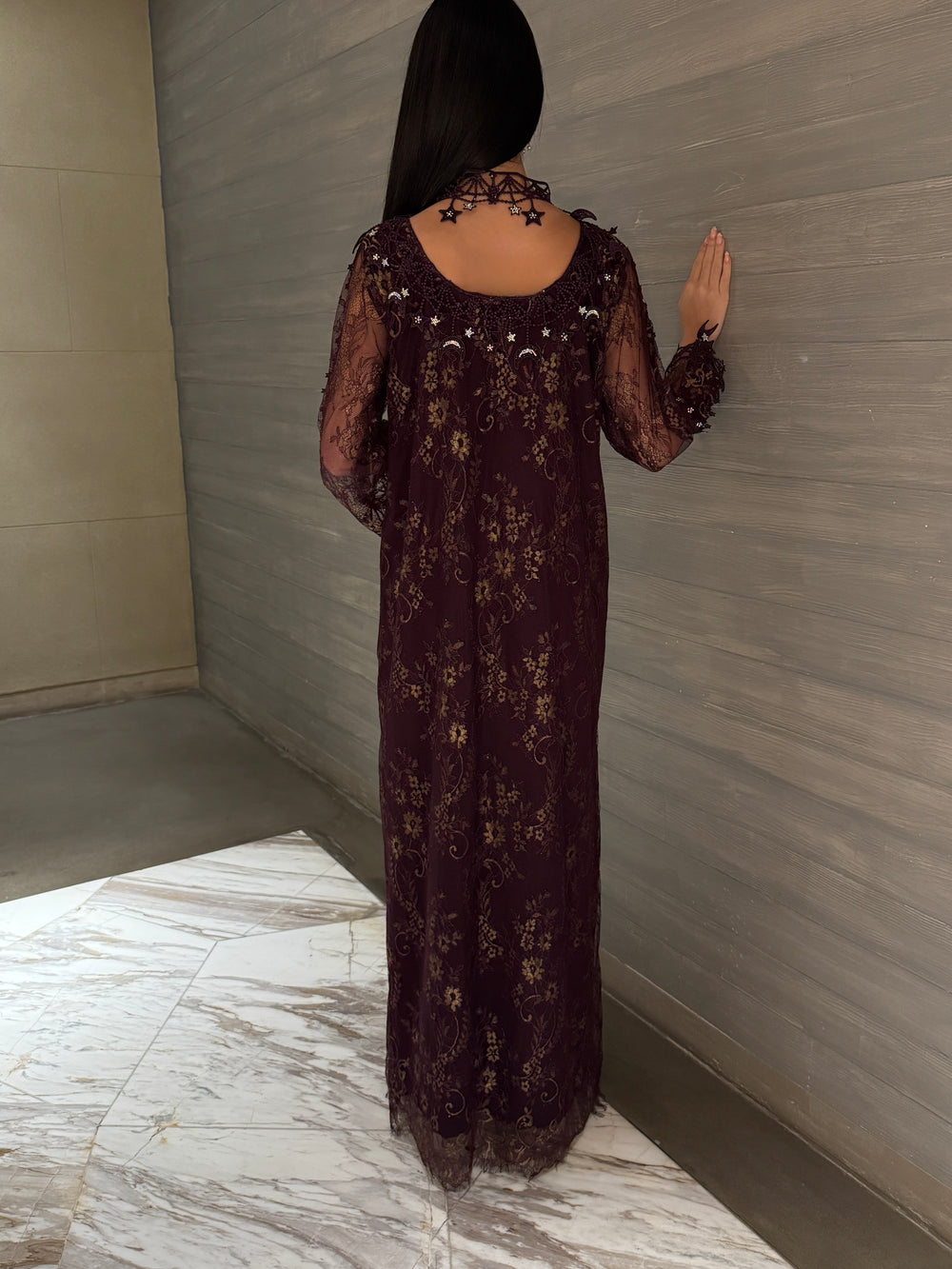 Sophisticated neckline with celestial-inspired detailing (moon and star motifs)